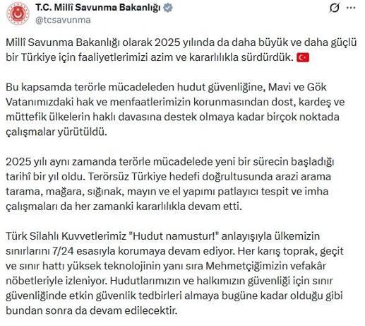 Bakanlığın sanal medya hesabından 2025 faaliyetlerinin yer aldığı bir video paylaşıldı. Paylaşımda, "Milli Savunma Bakanlığı olarak 2025 yılında da daha büyük ve daha güçlü bir Türkiye için faaliyetlerimizi azim ve kararlılıkla sürdürdük.