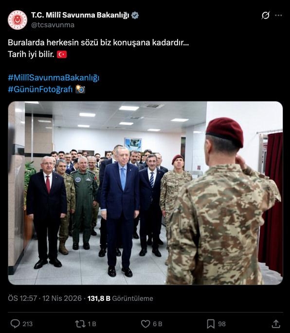 Milli Savunma Bakanlığı (MSB), Cumhurbaşkanı Recep Tayyip Erdoğan'ın bulunduğu bir kareyi "Buralarda herkesin sözü biz konuşana kadardır. Tarih iyi bilir." notuyla paylaştı.