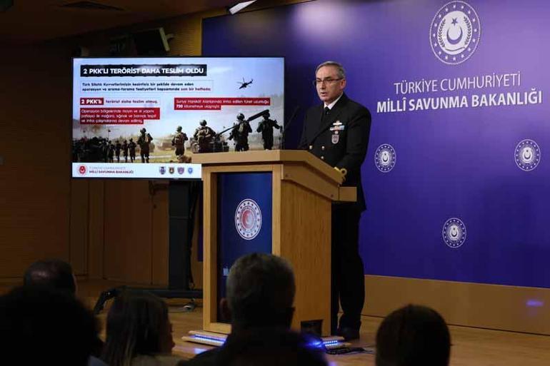 MSB Basın ve Halkla İlişkiler Müşaviri ve Bakanlık Sözcüsü Tuğamiral Zeki Aktürk, son 1 haftada yapılan faaliyetlere ilişkin bakanlıkta basın bilgilendirme toplantısı düzenledi. Tuğamiral Zeki Aktürk, son 1 haftada 2 PKK'lı teröristin teslim olduğunu, operasyon bölgelerinde mayın ve el yapımı patlayıcı ile mağara, sığınak ve barınak tespit ve imha çalışmalarına devam edildiğini, Suriye Harekat alanlarında imha edilen tünel uzunluğunun 720 kilometreye ulaştığını kaydetti. Tuğamiral Aktürk, hudut güvenliğine ilişkin de hafta boyunca yasa dışı yollarla sınırı geçmeye çalışan 1’i terör örgütü mensubu olmak üzere 244 kişinin yakalandığını, 707 kişinin ise hududu geçemeden engellendiğini, böylece, yıl içerisinde sınırlardan yasa dışı yollarla geçmeye çalışırken yakalananların sayısının 8 bin 545, hududu geçemeden engellenen kişi sayısının da 57 bin 345 olduğunu bildirdi. Aktürk, Hakkari hudut hattında 32 kilogram uyuşturucu ele geçirildiğini de ifade etti.