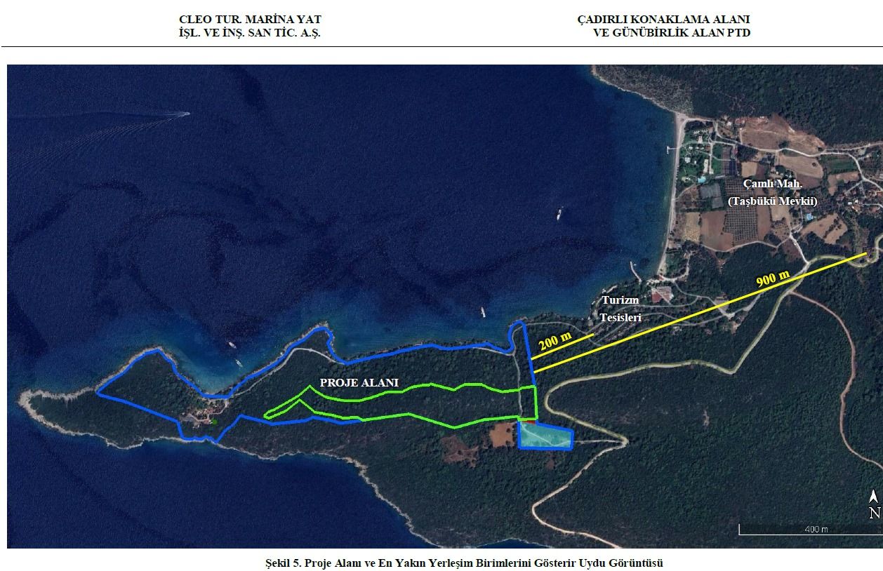 Proje dosyasında, 49 adet lüks çadır için 200 m²’lik platformlar ve 800 metre uzunluğunda, 6 metre genişliğinde araç yolu bulunduğu belirtiliyor. Raporda “ağaç kesilmeyeceği” ifade edilse de, bitki örtüsünün temizleneceği ve 177 m³ kaya kırılacağı bilgisi yer alıyor.