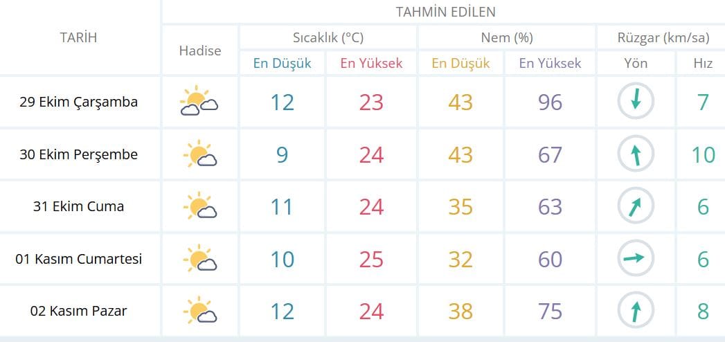 29 Ekim Çarşamba: 23 derece30 Ekim Perşembe: 24 derece31 Ekim Cuma: 24 derece1 Ekim Cumartesi: 25 derece2 Kasım Pazar: 24 derece