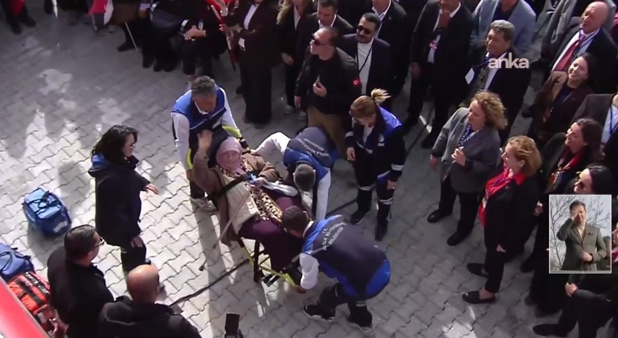 Yaşlı bir kadın vatandaş sedyeyle ambulansa götürülürken, Özel'e el sallayıp sevgi gösterisinde bulundu.