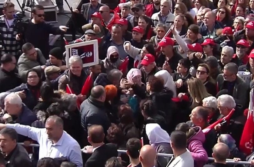 Miting sırasında bir vatandaşın rahatsızlandığını fark eden CHP lideri Özel, alanda bulunan parti görevlilerinden yardım istedi.