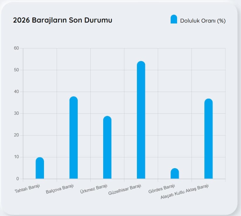 Tahtalı Barajı: %10,00Balçova Barajı: %37,96Ürkmez Barajı: %28,95Güzelhisar Barajı: %54,22Gördes Barajı: %4,95Alaçatı Kutlu Aktaş Barajı: %36,97YAĞIŞLAR ETKİLİ OLDU: TAHTALI BARAJI’NDA 3 GÜNLÜK YÜKSELİŞTahtalı Barajı’nda doluluk oranı, etkili olan yağış ve sağanakların ardından 3 Şubat’ta yüzde 8,94 iken 4 Şubat’ta yüzde 9,61’e, 5 Şubat itibarıyla ise yüzde 10,00’a yükselerek üç günde toplam 1,06 puanlık artış gösterdi.