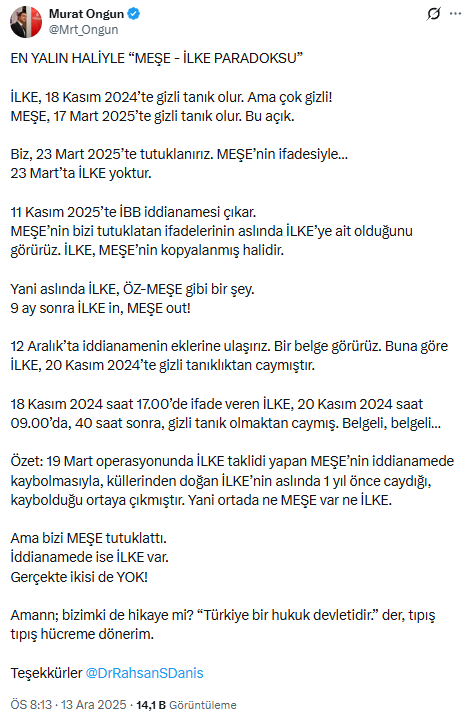 Ongun, iddianamedeki İlke ve Meşe 'paradoksu'na açıklık getirdiği paylaşımında, "Ortada ne MEŞE var ne İLKE. Ama bizi MEŞE tutuklattı. İddianamede ise İLKE var"