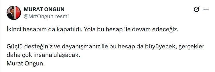 MrtOngun_resmi kullanıcı adına sahip yeni X hesabından yaptığı ilk paylaşımda Murat Ongun, şunlara yer verdi: