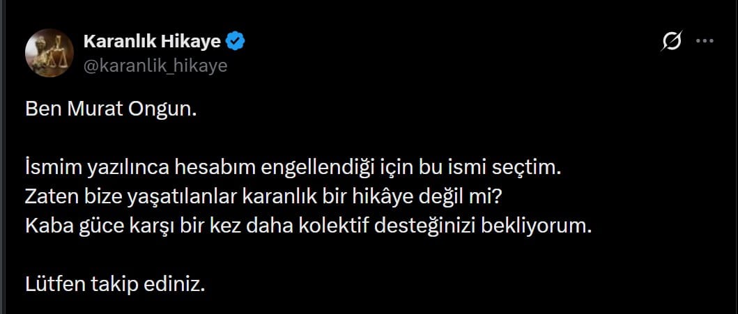 "Ben Murat Ongun. İsmim yazılınca hesabım engellendiği için bu ismi seçtim. Zaten bize yaşatılanlar karanlık bir hikâye değil mi? Kaba güce karşı bir kez daha kolektif desteğinizi bekliyorum. Lütfen takip ediniz."