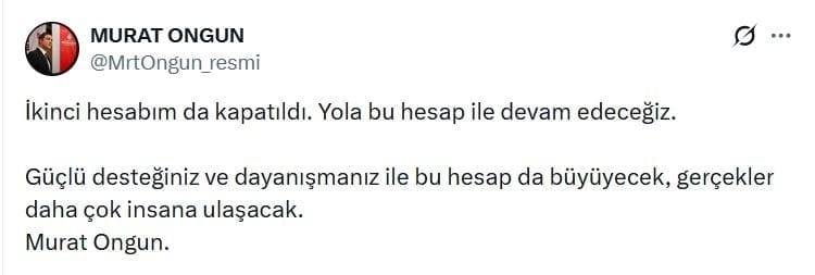 Ongun'un geçtiğimiz günlerde yaptığı dikkat çekici açıklamaların ardından, kullandığı X hesabı Türkiye’den görünmez kılınarak erişime kapatılmıştı. Bu gelişme üzerine "MrtOngun_resmi" kullanıcı adıyla yeni bir hesap açan Ongun, 13 Ocak 2026 tarihinde bu hesabının da kapatıldığını duyurmuştu.