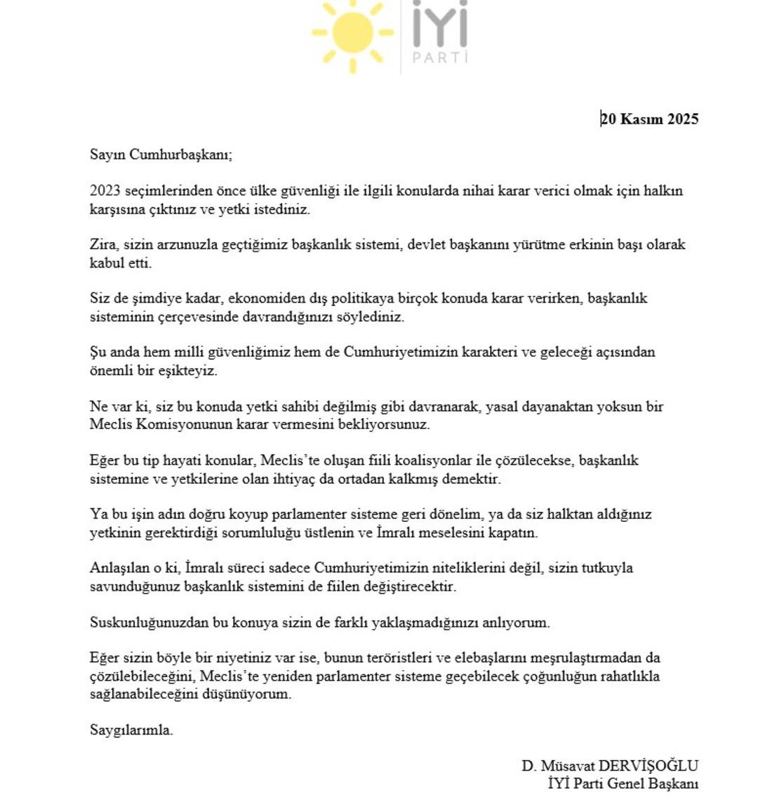 İYİ Parti Genel Başkanı Müsavat Dervişoğlu, mektubunda şu ifadelere yer verdi: