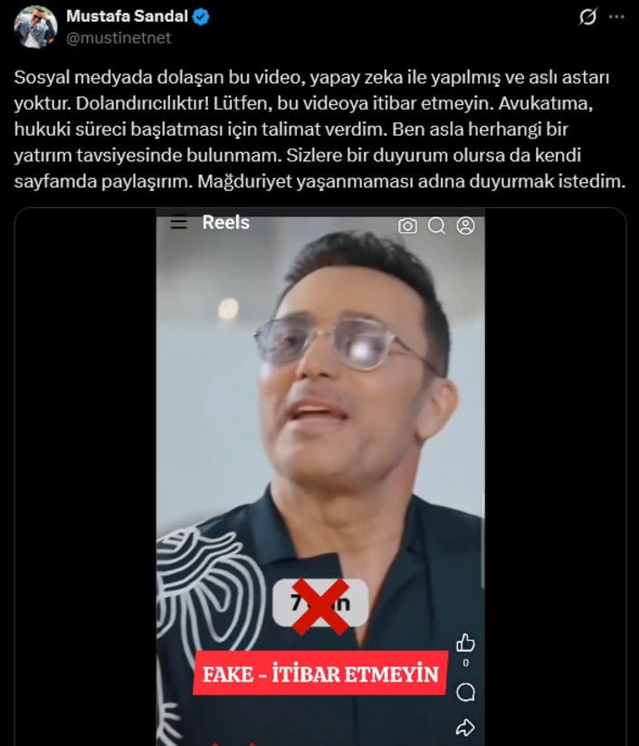 "MAĞDURİYET YAŞANMAMASI İÇİN DUYURUYORUM"Açıklamasının sonunda takipçilerine seslenen Mustafa Sandal, olası mağduriyetlerin önüne geçmek amacıyla bu uyarıyı yaptığını belirtti. Sandal, sahte içeriklere karşı dikkatli olunması çağrısında bulundu.