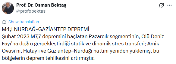 OSMAN BEKTAŞ’TAN UYKULARI KAÇIRACAK AÇIKLAMA!Nurdağı'nda meydana gelen depremin ardından Prof. Dr. Osman Bektaş’tan korkutan bir açıklama geldi. Bektaş, sosyal medya hesabından yaptığı açıklamada, deprem riskinin arttığını ifade ederek 3 bölgeye işaret etti.