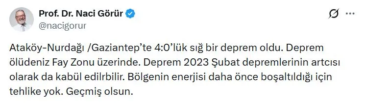 Depremin Ölüdeniz Fay Zonu üzerinde olduğunu söyleyen Görür, sosyal medya hesabından yaptığı açıklamada, "Ataköy-Nurdağı (Gaziantep) merkezli, 4.0 büyüklüğünde sığ bir deprem meydana geldi. Deprem, Ölüdeniz Fay Zonu üzerinde kaydedildi. Bu sarsıntı, Şubat 2023 depremlerinin artçısı olarak da kabul edilebilir. Bölgenin enerjisi daha önce boşaltıldığı için büyük bir tehlike arz etmemektedir. Geçmiş olsun." sözlerini sarf etmişti.