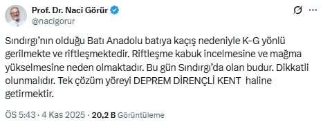 “Sındırgı’nın bulunduğu Batı Anadolu, batıya doğru kaçış nedeniyle kuzey-güney yönlü gerilme altındadır. Bu durum kabuğun incelmesine ve magmanın yükselmesine yol açmaktadır. Bugün Sındırgı’da yaşananlar da bunun sonucudur. Dikkatli olunmalı; bölgeyi deprem dirençli kent haline getirmek dışında bir çözüm yoktur.”