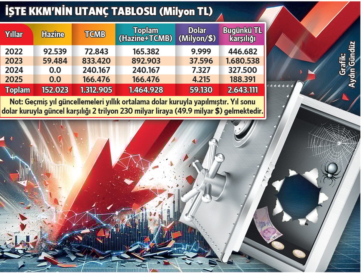 Maliye’nin bütçe dengelerini 2022 ve 2023’te alt üst eden, Merkez Bankası’na (TCMB) 2023, 2024 ve 2025 yılları boyunca sürekli zarar ettiren KKM için Merkez Bankası kaynaklarından 1.3 trilyon lira, Hazine’den 152 milyar lira para aktarıldı. Merkez Bankası’nın üzerine yıkılan ağır yük, güncel kurlarla 1 trilyon 736 milyar lirayı, Hazine’nin yükü de 362 milyar lirayı buldu.