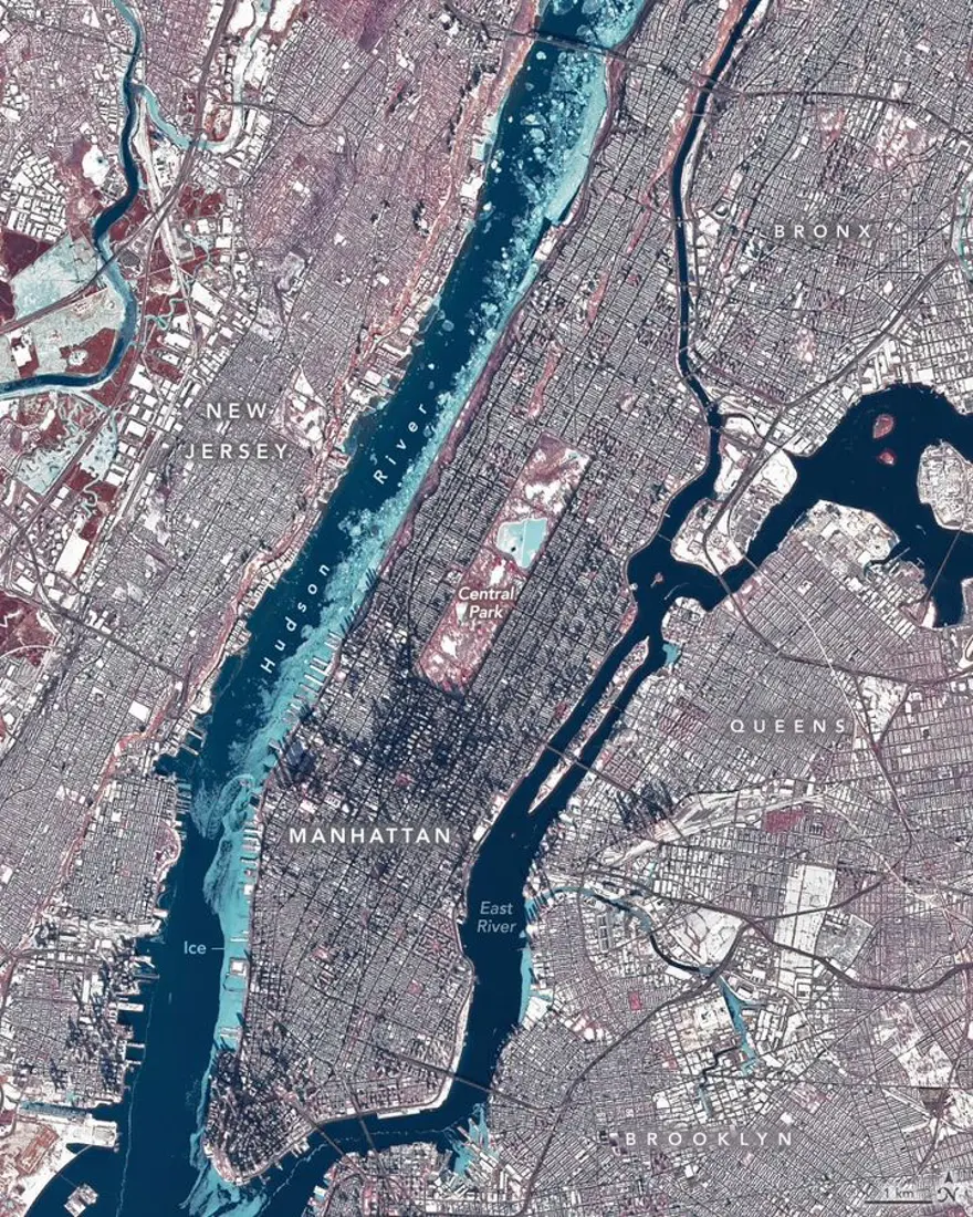 LANDSAT 8’DEN YÜKSEK ÇÖZÜNÜRLÜKLÜ DETAYLARDünyayı gözlemlemek amacıyla 2013 yılında fırlatılan Landsat 8 uydusu, donmuş kenti öğle saatlerinde en net haliyle görüntüledi. Sahte renk teknolojisiyle oluşturulan analiz görüntüsünde; buzlar açık mavi, bitki örtüsü ise kırmızı tonlarda vurgulandı. Fotoğrafta ayrıca kenti kaplayan taze kar tabakasının yanı sıra, kış güneşinin eğik açısı nedeniyle gökdelenlerin oluşturduğu uzun gölgeler de dikkat çekti.