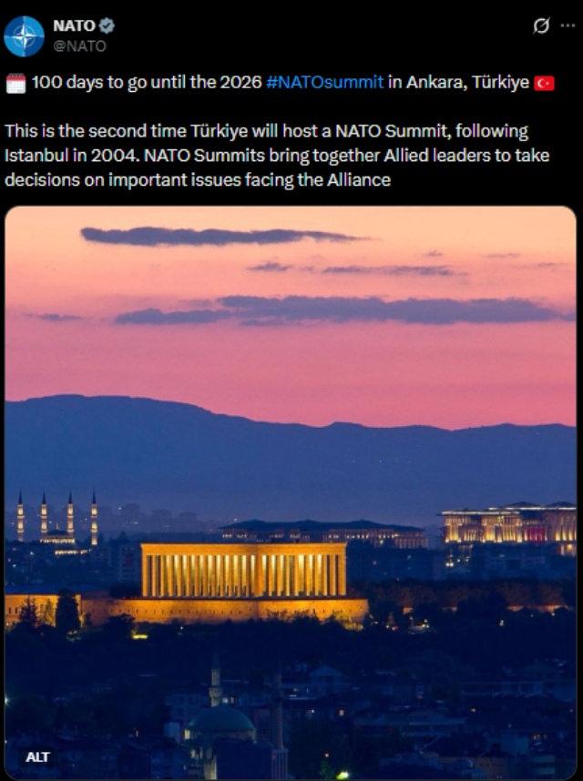 NATO'nun sanal medya hesabından Anıtkabir'in fotoğrafının yer aldığı paylaşımda, “ Ankara'da düzenlenecek 2026 NATO Zirvesi'ne 100 gün kaldı. Türkiye, 2004 yılında İstanbul’da gerçekleşen zirvenin ardından ikinci kez NATO Zirvesi’ne ev sahipliği yapacak. NATO Zirveleri, İttifak'ın karşı karşıya olduğu önemli konularda kararlar almak üzere müttefik liderleri bir araya getiriyor” ifadeleri kullanıldı.