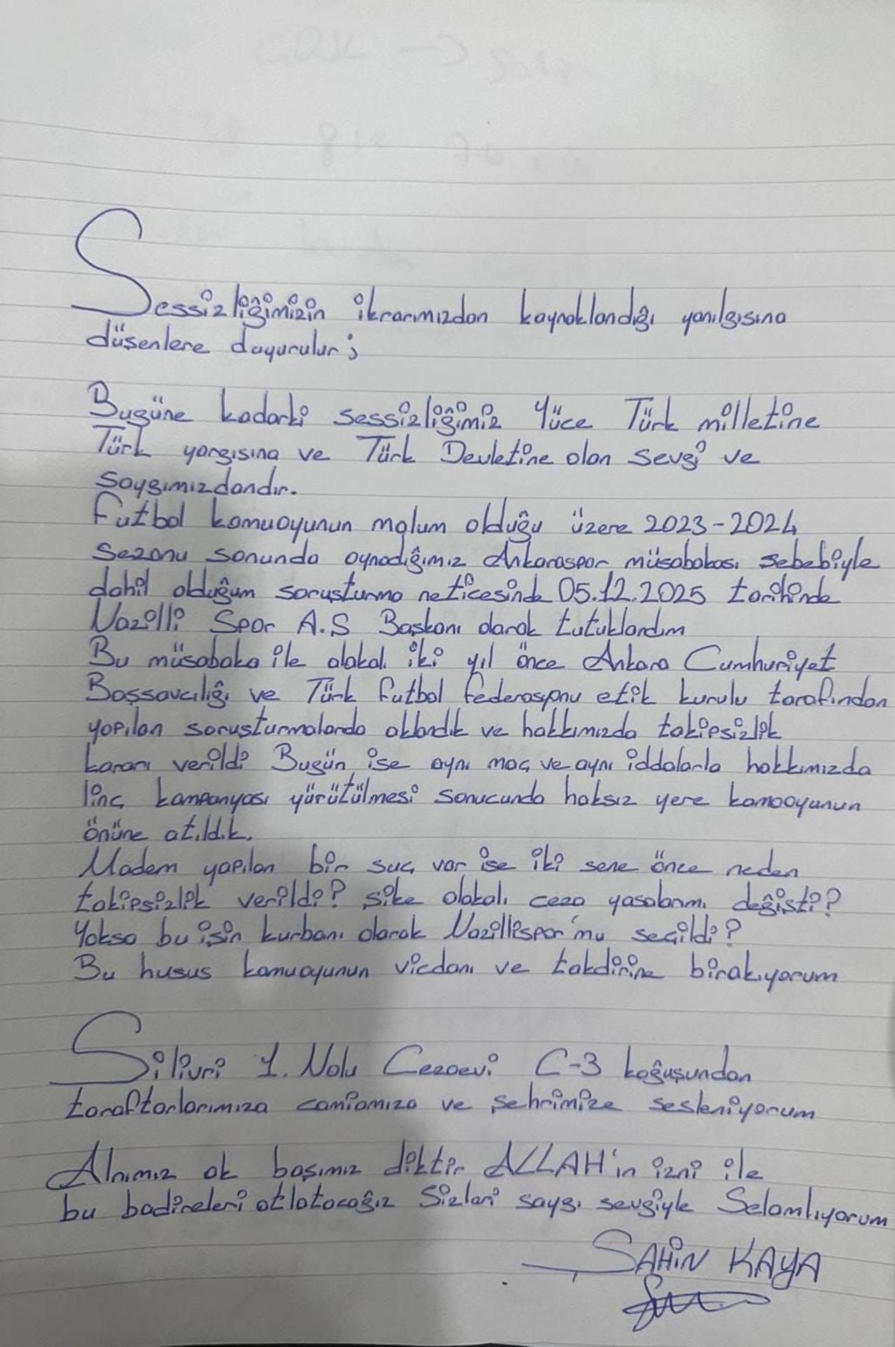 TFF 3. Lig 4. Grup'ta son sırada yer alan Nazilli Spor'da "Futbolda bahis" soruşturmasında gözaltına alındıktan sonra şike yaptığı gerekçesiyle tutuklanan Başkan Şahin Kaya, Silivri Cezaevi'nden mektup yazdı.
