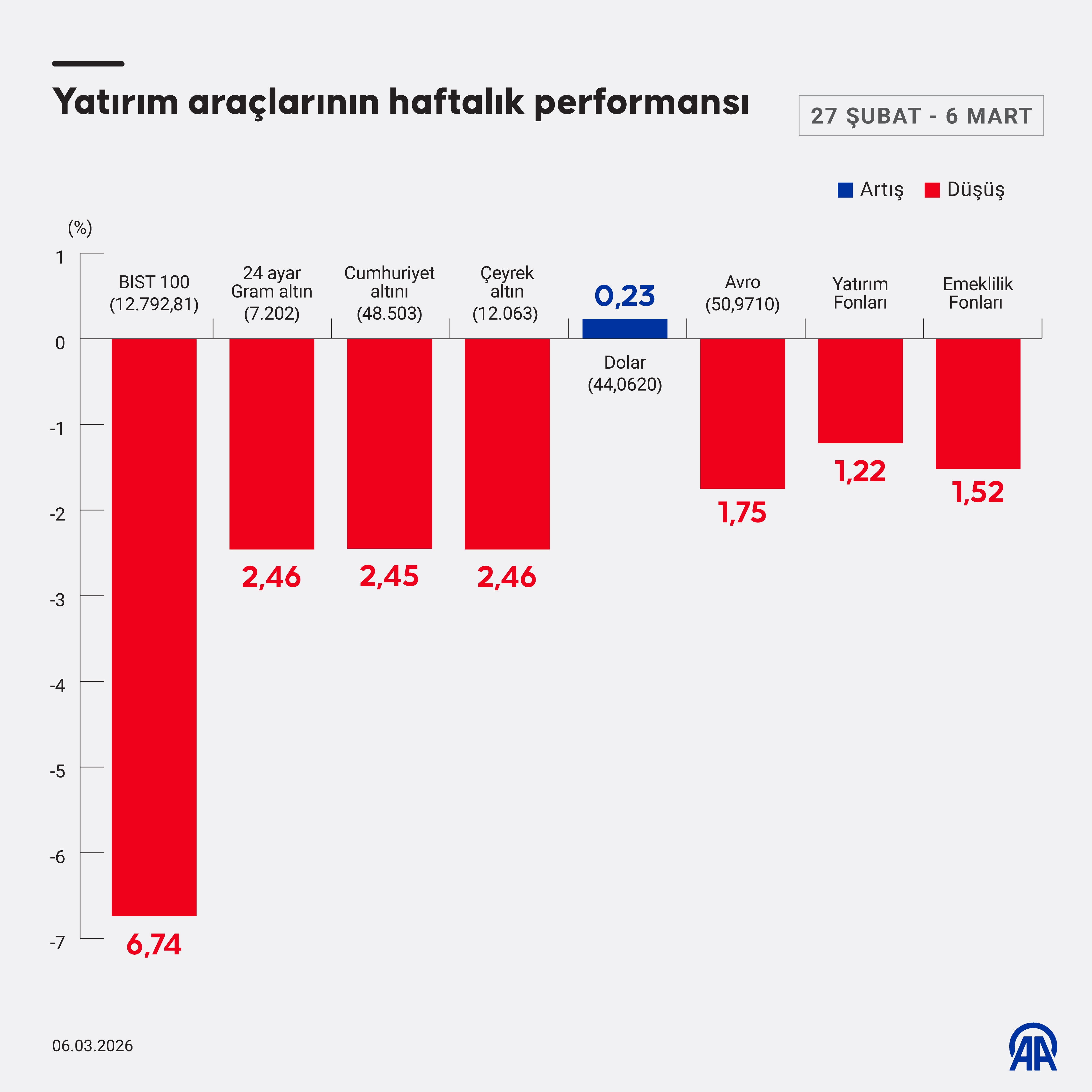 Borsa İstanbul'da işlem gören hisse senetleri haftalık bazda ortalama yüzde 6,74, altının gram fiyatı yüzde 2,46, euro/TL yüzde 1,75 değer kaybederken dolar/TL yüzde 0,23 değer kazandı.