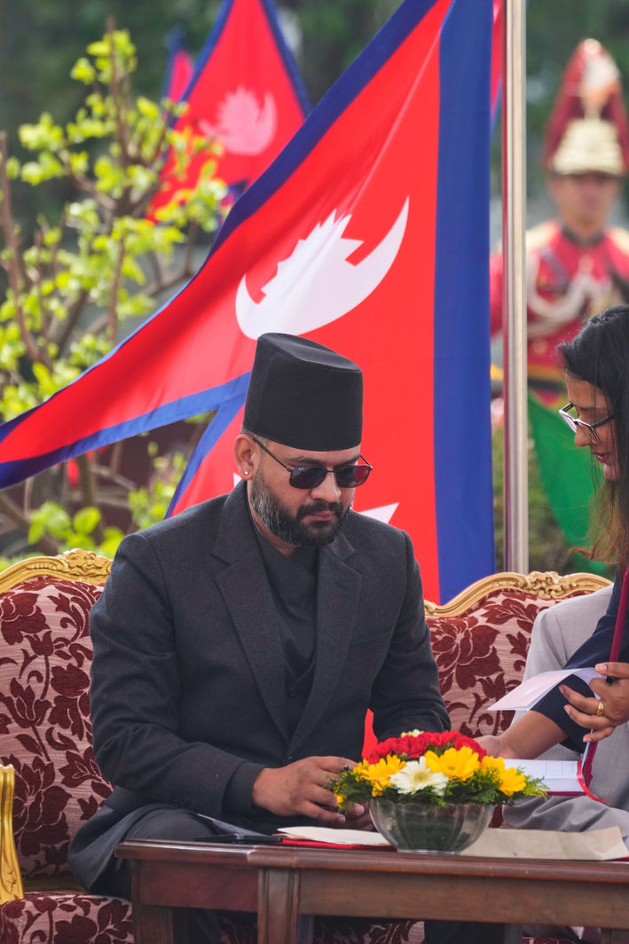 Dar kesim pantolonu kendine özgü siyah Nepali şapkası ve güneş gözlüğüyle dikkat çeken Şah, başkentteki Cumhurbaşkanlığı konutunda diplomatlar ve üst düzey yetkililerin katıldığı törenle yemin etti.