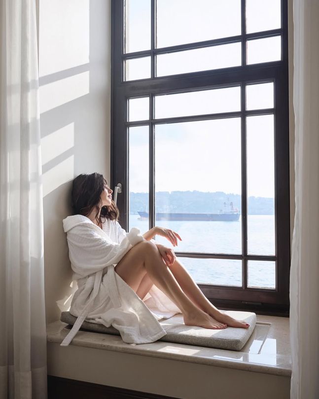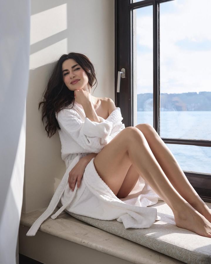 Nesrin Cavadzade, sosyal medya hesabından bornozlu pozlarını paylaştı.