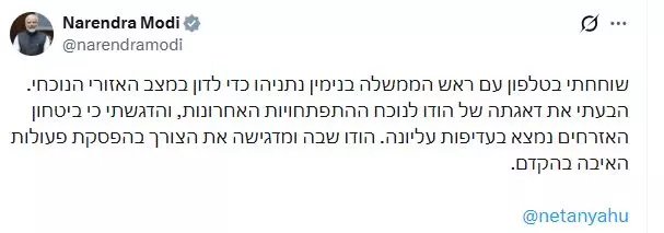 HİNDİSTAN BAŞBAKANI DA TOPA GİRDİTüm dünya bölgede olan biteni yakından takip ederken Hindistan Başbakanı Narendra Modi'den de dikkat çeken bir çıkış geldi. Sosyal medya hesabından yaptığı paylaşıma İsrail Başbakanı Netanyahu'yu da etiketleyen Modi, "Netanyahu ile telefon görüşmesi yaptım. Son gelişmelerden duyduğumuz endişeyi dile getirdim ve sivillerin güvenliğinin en büyük önceliğimiz olduğunu vurguladım. Hindistan, düşmanlıkların derhal sona erdirilmesi gerektiği konusundaki ısrarını yinelemektedir" ifadelerine yer verdi.