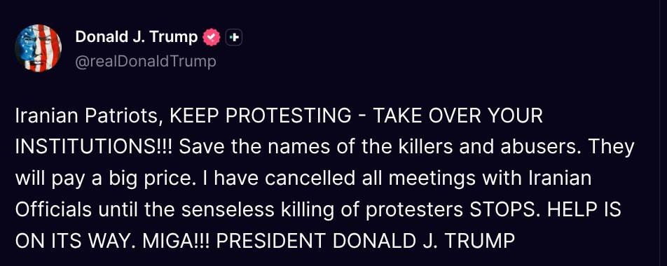 TRUMP'TAN İRAN HALKINA AYAKLANMA ÇAĞRISI: KURUMLARI ELE GEÇİRİNABD cephesinden gelen açıklamalar da yangına körükle gidiyor. ABD Başkanı Donald Trump, Truth Social hesabından yaptığı paylaşımda, İranlı yetkililerle planlanan tüm toplantıları iptal ettiğini duyurdu. İptal gerekçesi olarak "protestocuların anlamsızca öldürülmesini" gösteren Trump, İran halkına doğrudan çağrıda bulundu. Trump mesajında, protestolara devam edilmesi gerektiğini belirterek, kurumların ele geçirilmesi çağrısı yaptı ve "Katillerin ve zalimlerin isimlerini kaydedin. Çok büyük bedel ödeyecekler. Yardım yolda" ifadelerini kullandı. Bu mesaj, İran'da rejim karşıtı protestoların sürdüğü ve insan hakları örgütlerinin ölü sayısını 2 binin üzerinde açıkladığı bir atmosferde geldi.