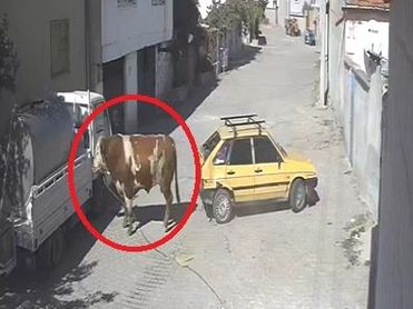 Ahırdan kaçan uzun süre sahibinin yakalamak için peşinden koştuğu boğa, sokakta, park halindeki otomobile boynuz darbeleriyle zarar verip, sürükledi.