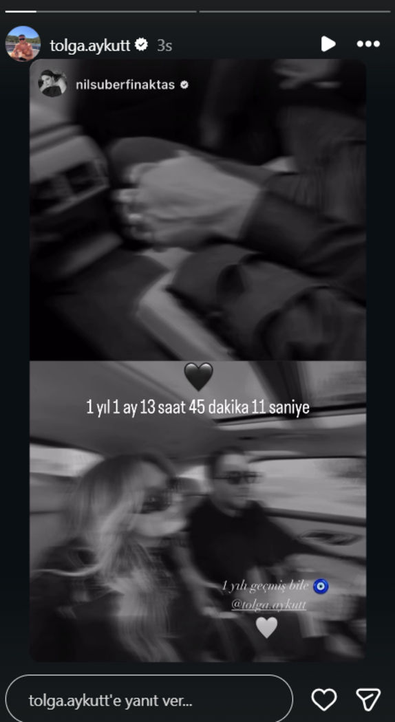 Nilsu Berfin Aktaş, sevgilisiyle çekilmiş romantik fotoğrafları paylaşarak; "Bir yılı geçmiş bile" notunu düştü. Tolga Aykut ise bu paylaşıma; "Bir yıl, bir ay, 13 saat 45 dakika 11 saniye" ifadesiyle karşılık verdi.