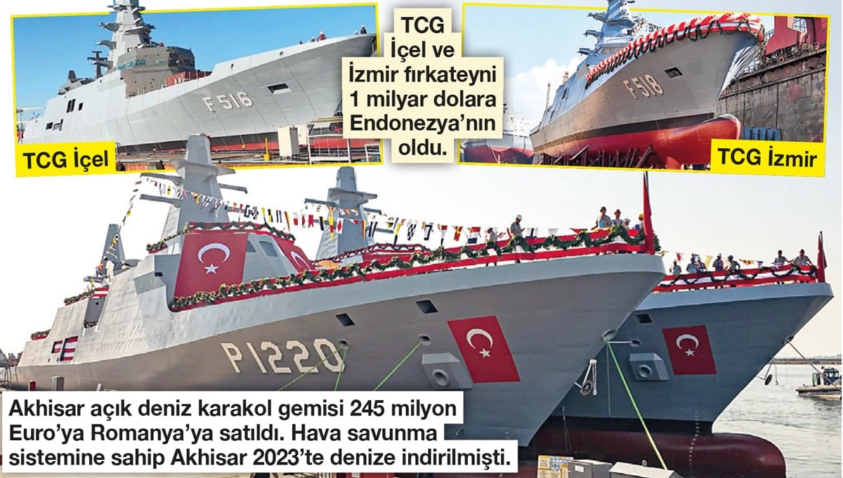Akhisar açık deniz karakol gemisi 245 milyon Euro’ya Romanya’ya, İçel ve İzmir fırkateyni de 1 milyar dolara Endonezya’ya satıldı. Bu gemilerin Deniz Kuvvetleri envanterine alındığı personelinin bile belirlendiği ancak bu planlamaların ardından satılmasının kararlaştırıldığı bildirildi.