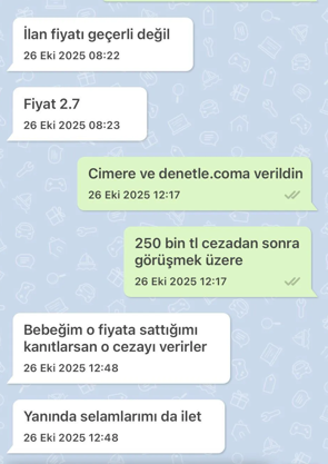 Bir ilan sitesinde aracını 2 milyon 420 bin 625 lira olarak satışa çıkaran ancak alıcıyla özel görüşmede 2 milyon 700 bin lira isteyen satıcıya, Ticaret Bakanlığı tarafından idari para cezası verildi. Sosyal medyada gündem olan olayda, satıcının alıcının fiyat farkına itiraz etmesi üzerine, “Bebeğim o fiyata sattığımı kanıtlarsan o cezayı verirler. Yanında selamlarımı da ilet” yanıtını verdiği görüldü.