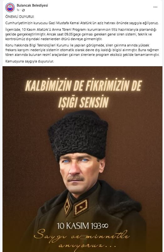 Açıklamada, "Cumhuriyetimizin kurucusu Gazi Mustafa Kemal Atatürk’ün aziz hatırası önünde saygıyla eğiliyoruz. İlçemizde, 10 Kasım Atatürk’ü Anma Töreni Programı kurumlarımızın titiz hazırlıklarıyla planlandığı şekilde gerçekleştirilmiştir. Ancak saat 09.05’te çalması gereken genel siren sistemi, teknik ve kontrolümüz dışındaki nedenlerden ötürü devreye girmemiştir. Konu hakkında Bilgi Teknolojileri Kurumu ile yapılan görüşmede, siren çalınma anında yüksek frekans karışımı nedeniyle sistemin otomatik olarak devre dışı kaldığı bilgisi alınmıştır. Buna rağmen tören alanında bulunan resmi araçlardan çalınan sirenlerle program eksiksiz şekilde tamamlanmıştır. Kamuoyuna saygıyla duyurulur" ifadeleri yer aldı.
