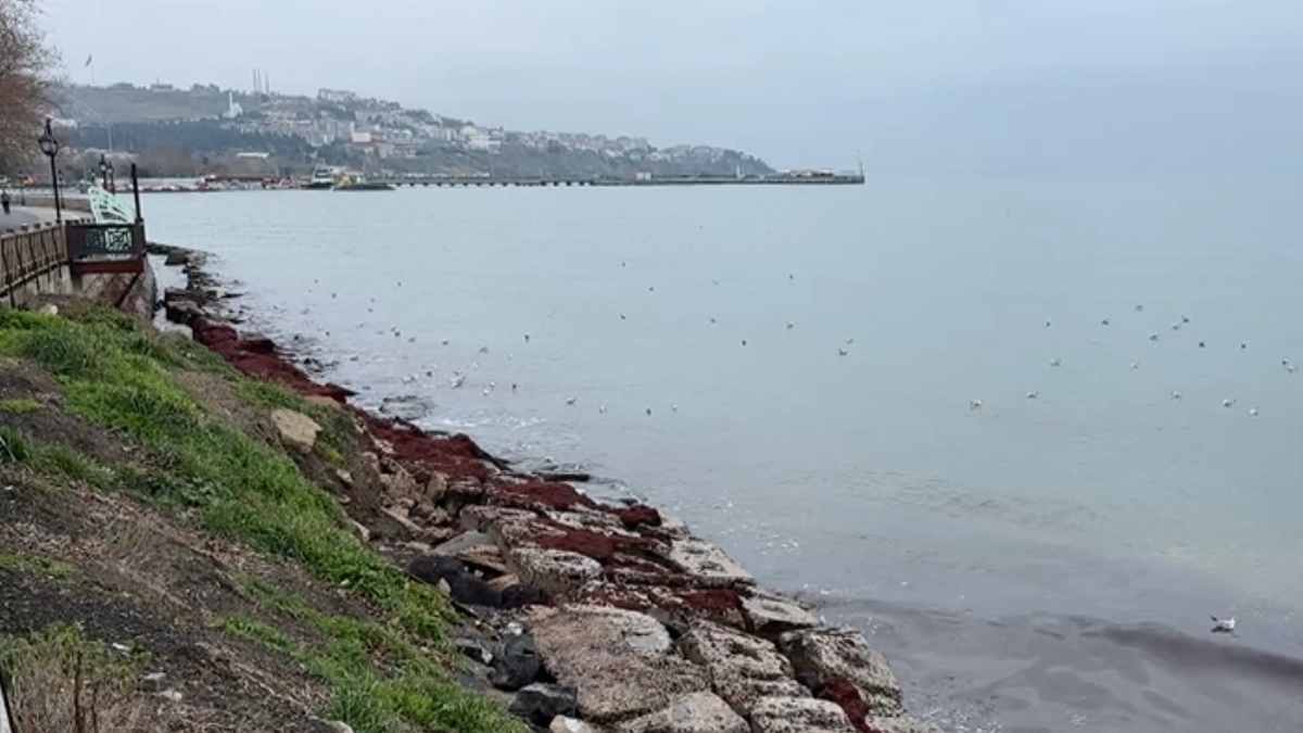 Süleymanpaşa ilçesinde sabah saatlerinde yürüyüşe çıkan vatandaşlar, alışılmışın dışında bir manzarayla karşılaştı. Deniz kıyısının masmavi rengi, poyrazın taşıdığı yosunlar nedeniyle yerini tamamen koyu kırmızı bir tona bıraktı. Rüzgarın hızıyla kıyıya vuran yosun birikintileri, bazı noktalarda diz boyuna ulaşan kalın tabakalar oluşturdu.