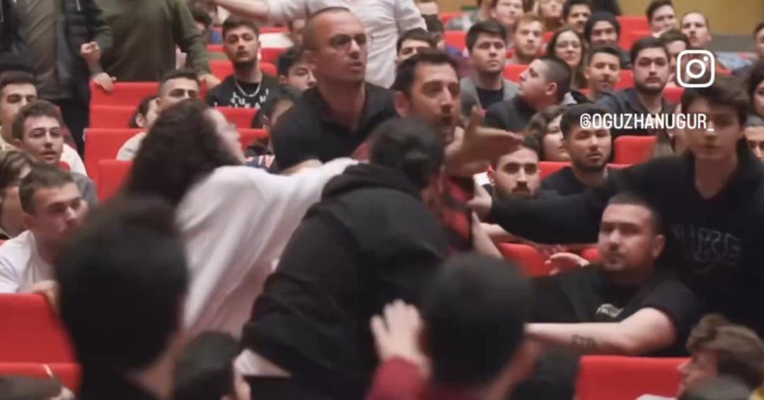 Videoda program başlamadan önce salondaki bazı kişilerin hararetli bir şekilde tartıştığı, tartışan tarafları yatıştırmak için araya salondaki diğer kişilerin görüldü.
