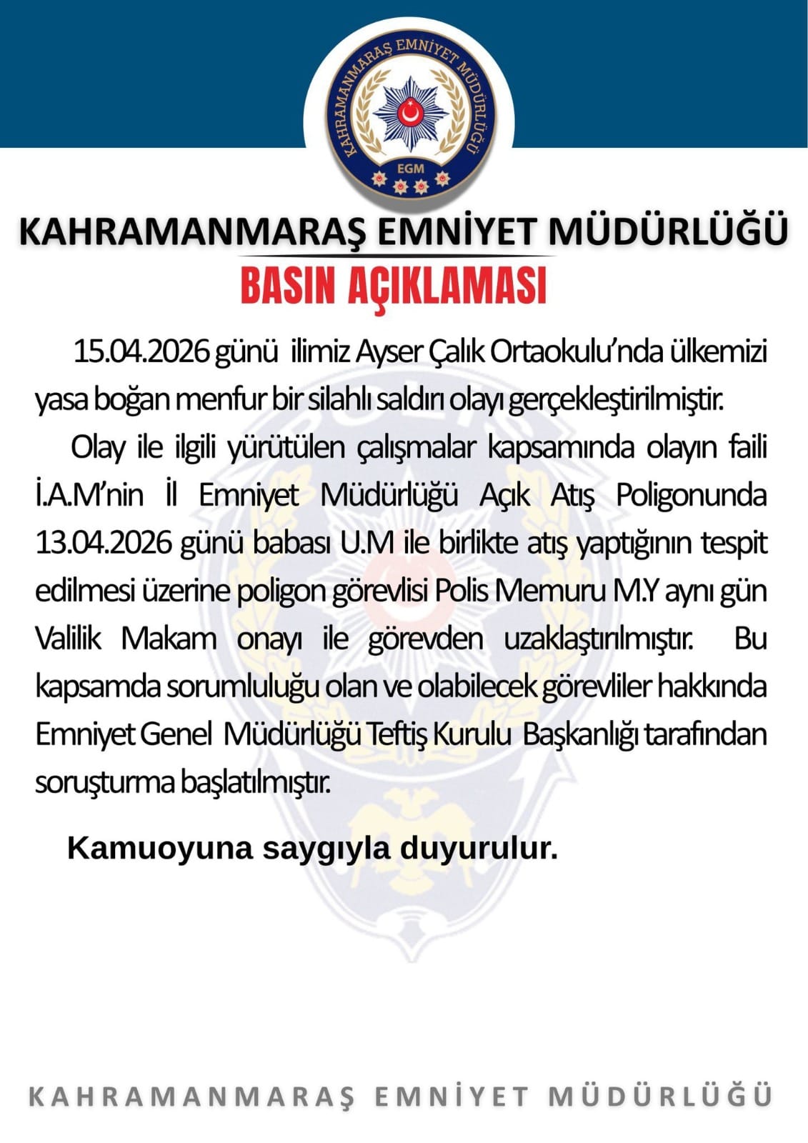 Kahramanmaraş’ta yaşanan okul baskınını gerçekleştiren ve 10 kişinin ölümüne yol açan 14 yaşındaki İsa Aras Mersinli'nin 1. Sınıf Emniyet Müdürü Polis Başmüfettişi olan babası Uğur Mersinli ile birlikte atış talimi yaptığı poligonun sorumlusu polis memurunun açığa alındığı belirtildi.