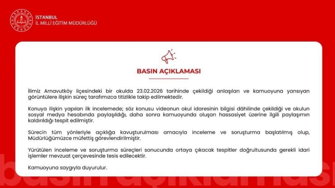 "İlimiz Arnavutköy ilçesindeki bir okulda 23.02.2026 tarihinde çekildiği anlaşılan ve kamuoyuna yansıyan görüntülere ilişkin süreç tarafımızca titizlikle takip edilmektedir.