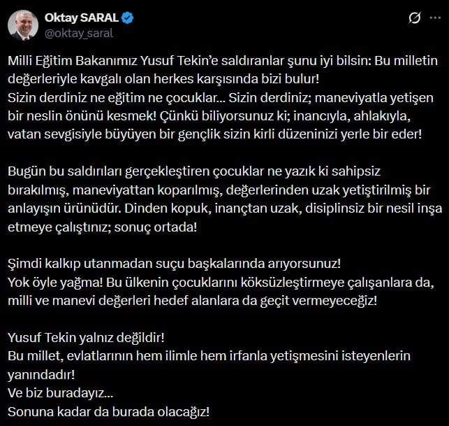 Bakan Tekin’e yönelik yükselen eleştirilere Cumhurbaşkanı Başdanışmanı Oktay Saral’dan sert bir yanıt geldi. Sosyal medya hesabı üzerinden açıklama yapan Saral, yaşanan şiddet olaylarının sorumluluğunu "dinden kopuk bir gençlik inşasına" bağlayarak topu muhalefete ve eleştirenlere attı.