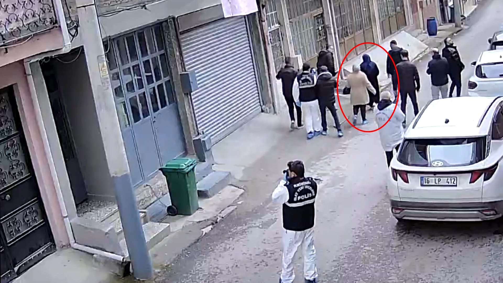 3 çocuk annesi kadın beraberindeki savcı ve polislerle birlikte yer gösterme yapıp olayı anlatırken o anlar, çevredeki bir evin güvenlik kamerasına yansıdı. (DHA)