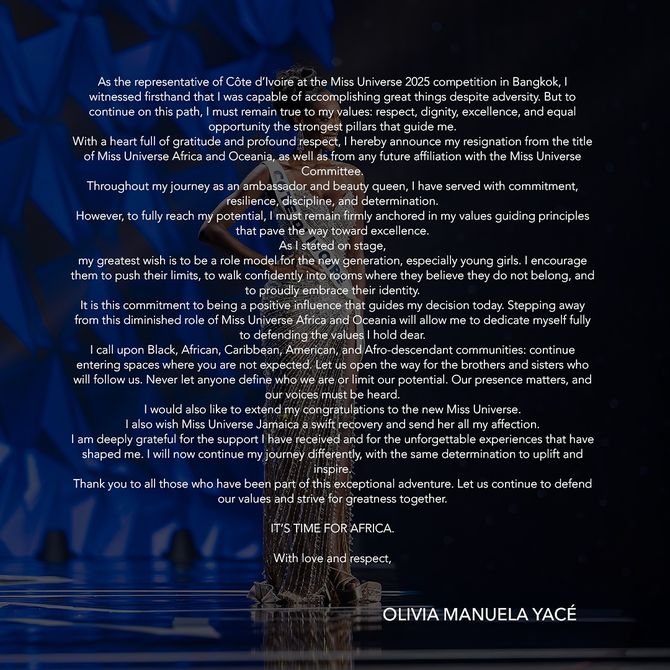Olivia Yacé, Instagram hesabından yaptığı uzun açıklamada; yarışmanın kendisine önemli deneyimler kazandırdığını ancak kişisel değerlerinin bu yola devam etmesine izin vermediğini belirtti. Açıklamasında şu ifadeler yer aldı: Fildişi Sahili temsilcisi olarak Bangkok'taki Miss Universe 2025 yarışmasında, zorluklara rağmen harika şeyler başarabileceğimizi ilk elden deneyimledim. Ancak bu yolda devam etmek için, bana rehberlik eden en güçlü sütunlar olan değerlerime sadık kalmalıyım: saygı, itibar, mükemmeliyet ve eşit fırsat. Derin bir minnet ve saygı dolu bir kalp ile, Miss Universe Africa and Oceania ünvanından ve Miss Universe Komitesi ile gelecekteki herhangi bir bağlantımdan istifa ettiğimi bu vesileyle duyuruyorum.