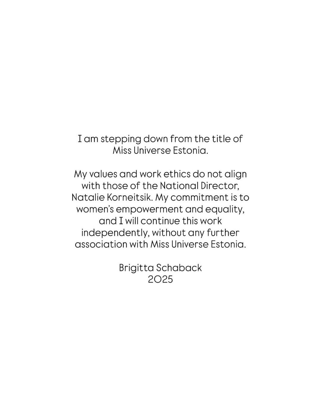 "İŞ AHLAKIM İLE UYUŞMUYOR" Brigitta Schaback; "Miss Universe Estonya ünvanından ayrılıyorum. Değerlerim ve iş ahlakım, Ulusal Direktör Natalie Korneitsik ile uyuşmuyor. Benim taahhüdüm kadınların güçlendirilmesi ve eşitliktir. Bu çalışmayı Miss Universe Estonya ile herhangi bir bağım olmadan, bağımsız şekilde sürdüreceğim." şeklindeki ifadeleri kullandı.