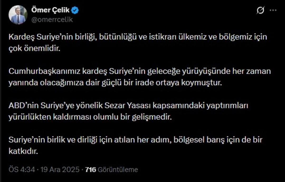 ABD ile Suriye arasındaki normalleşme adımları devam ediyor. ABD son olarak Suriye'ye karşı yürürlükte olan yaptırımları kaldırdı. Konuyla ilgili olarak AK Parti Sözcüsü Ömer Çelik bir açıklama yaptı.
