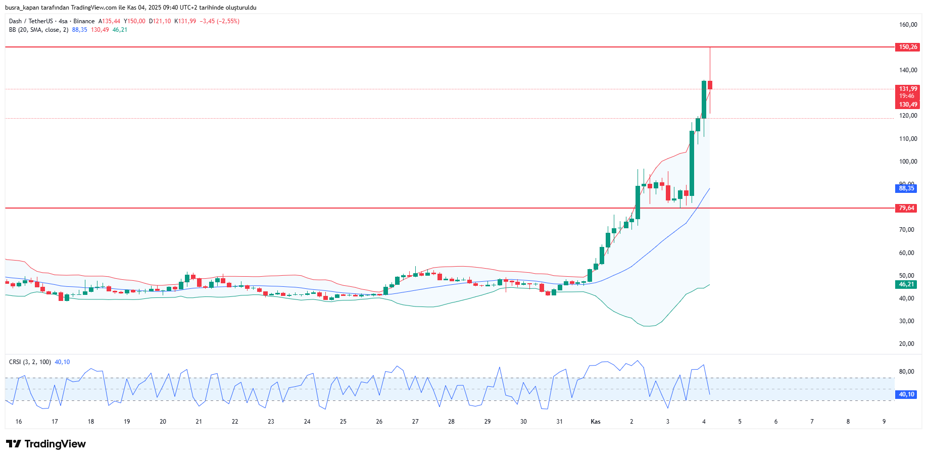 Dash'ın 4 saatlik grafiği incelendiğinde; Ekim sonundaki konsolidasyonu kırarak güçlü bir boğa trendi başlattığı görülürken, fiyat 112-130 USDT bandında, 115 direnci test ediliyor. Bollinger genişlemesi, EMA golden cross ve MACD bullish crossover yükselişe destek veriyor.