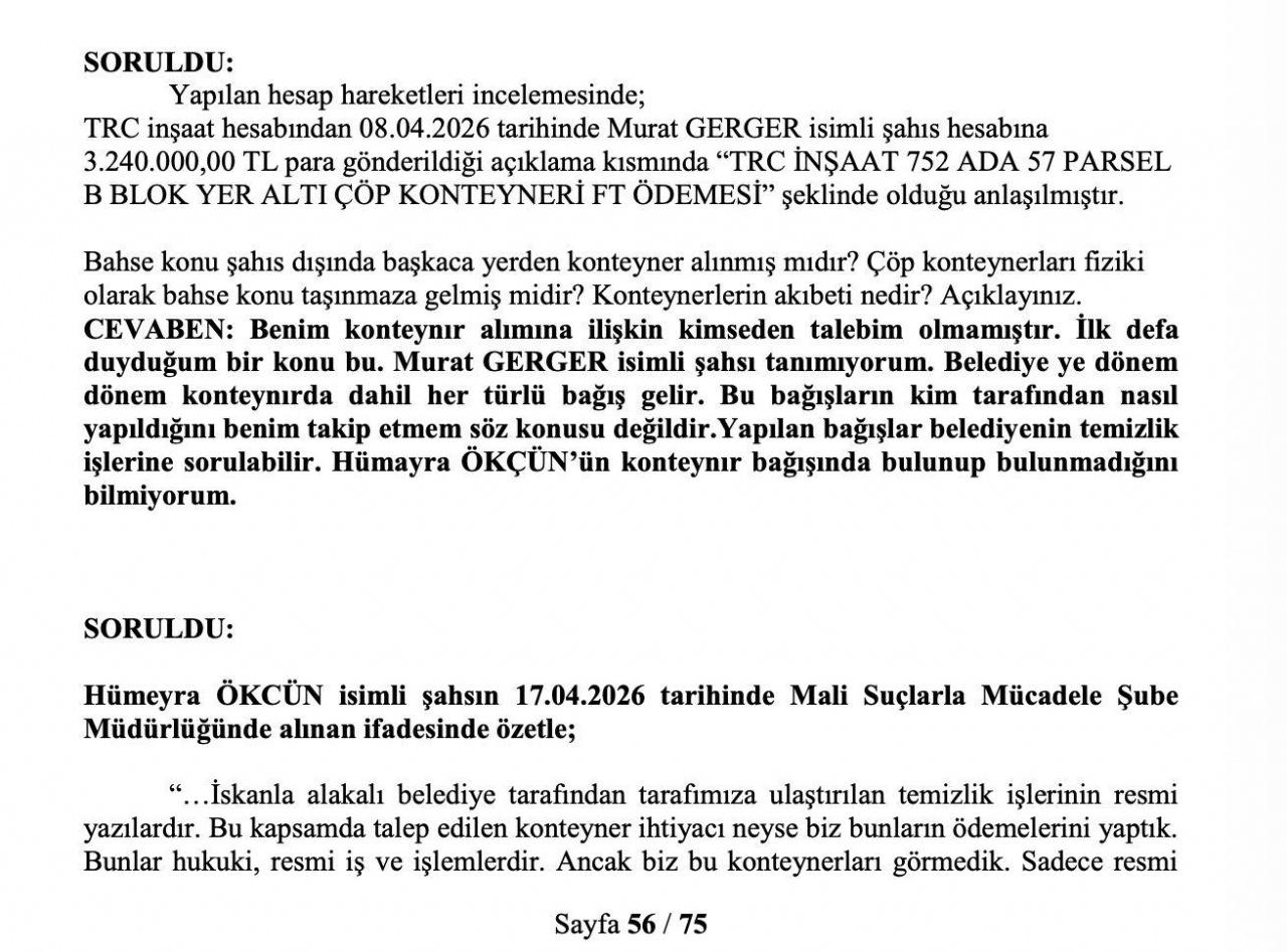 Dosyadaki ikinci eylemde ise iş kadını belediye tarafından Hümeyra’ya iskân ve yapı ruhsat işlemleri kapsamında rüşvet olarak sözde 2 milyon 240 bin TL’lik çöp konteyneri alımı yaptırıldığı ortaya çıktı.