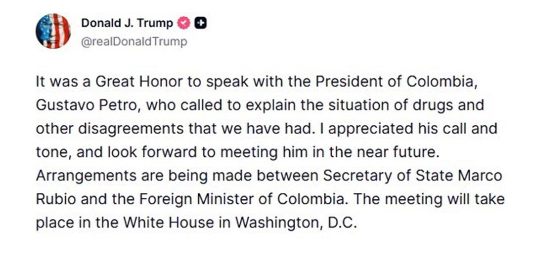 Kolombiya Devlet Başkanı Gustavo Petro ise, Bogota'da düzenlenen bir mitingde yaptığı konuşmada görüşmeyi doğrulayarak, "(Trump) Başkan olduğundan beri ilk kez telefonda konuştuk" dedi. Petro, iki ülke arasında diyaloğun yeniden başlatılmasını talep ettiğini ifade etti.
