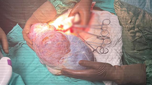 Op. Dr. Selim Akçay tarafından yapılan ameliyatta, Atiye A.'nın karın bölgesinde 24 santimetre boyunda, 5 kilogram ağırlığında kitle çıkarıldı.