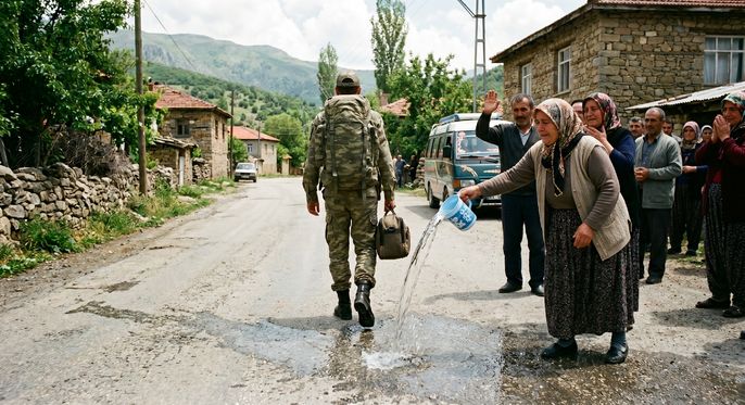 ASKERE GİDENİN ARKASINDAN SU DÖKMETürk kültüründe yaygın ve sembolik anlamı güçlü bir uğurlama ritüelidir. Askere giden kişinin evden çıkışının ardından, genellikle annesi ya da bir yakını kapının önüne su döker.