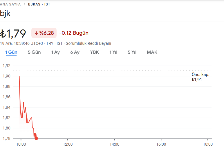 Borsa İstanbul’da Beşiktaş Futbol Yatırımları (BJKAS) payları sert satış baskısı altında kaldı. Hisse, gün içinde yüzde 6’yı aşan düşüşle 1,79 liraya gerilerken, önceki kapanış olan 1,91 liranın belirgin şekilde altına indi. Yaşanan hızlı değer kaybı sonrası hissede volatilite arttı.
