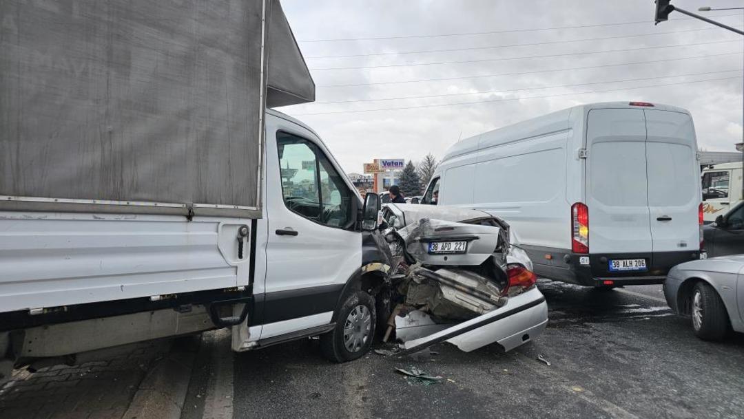 Edinilen bilgiye göre, Şeker Mahallesi Osman Kavuncu Bulvarı üzerinde 38 EG 323 plakalı kamyonet, duramayarak kırmızı ışıkta bekleyen 38 APD 221 plakalı otomobile arkadan çarptı. Otomobil çarpmanın şiddeti ile önünde bulunan 38 ANG 696 plakalı nakliye aracına çarparak, iki aracın arasında kaldı. 38 EG 323 plakalı kamyonet ise çarpmanın ardından refüje çıkarak, bariyerlere girip durabildi.