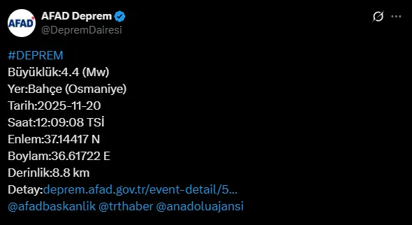 DERİNLİK 8.8 KİLOMETREAfet ve Acil Durum Yönetimi Başkanlığı'nın (AFAD) aktardığı bilgilere göre; Osmaniye'nin Bahçe ilçesinde 4.4 büyüklüğünde deprem meydana geldi. Sarsıntı saat 12.09'da yaşandı, derinliği ise 8.8 kilometre olarak ölçüldü.