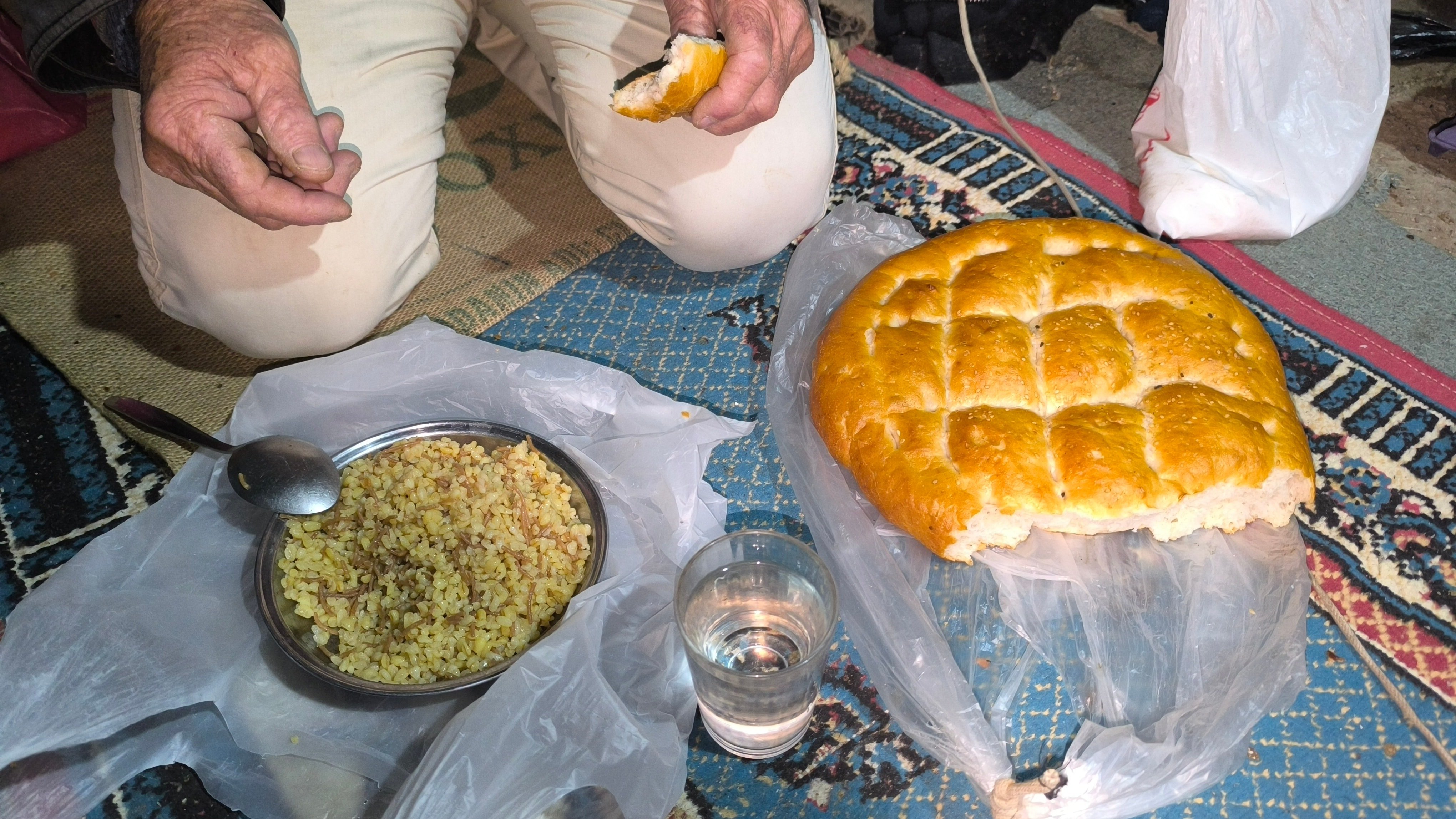 Orada bir yatağım var, orada bir tüpüm var, bir ufak kazanla bir demliğim var. Her gün çay, başka ne yiyeceksin ki? Yemek olup da yetmiyor . Her gün bulgur pilavı da yenmez ki. Her gün bulgur pilavı yenir mi? Yenmez. Barakada yok sobamız bizim burada. Çadırda da yakamadık zaten üç seneden beri, burada da yok. Soğuk havalarda ne yapacaksın? Yatağa giriyorsun, öyle yumuluyorsun. Başka ne olacak ki? Yatağa giriyorsun tamam. Bir ihtiyacım olursa motosikletle gidiyorum. Ekmek de yok, bakkal da yok. İki güne bir ekmeği oraya buraya rezilliğin biri bin para. Şu anda niyetliyim, sağ olsun arkadaşın biri geldi, arabasıyla gittik Hemite Köyü'nden ekmek aldık geldik. Ekmek aldık, başka ne yiyeceksin ki? Gündüzden yaptığımız bir pilav vardı, olmazsa pilavı yeriz, başka bir şeyimiz yok ki."