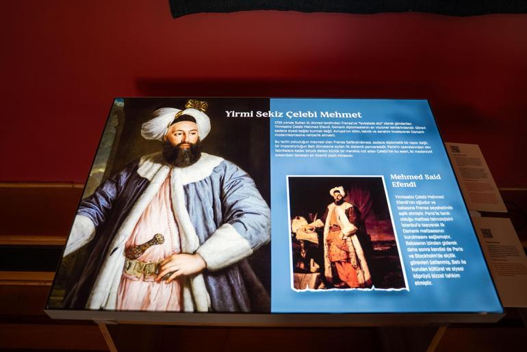 Sergi kapsamında, 1729 yılında III. Ahmed tarafından Fransa’ya büyükelçi olarak atanan Yirmisekiz Çelebi Mehmet Efendi’nin görev sürecine dair kaleme aldığı Fransa Sefâretnâmesi, görsel anlatılarla yeniden canlandırıldı. Sergide Çelebi’nin Fransa’ya yolculuğundan, veba korkusuyla girdiği karantinaya ve katıldığı sosyal etkinliklere kadar birçok detay, yapay zeka destekli modellemelerle görselleştirildi.